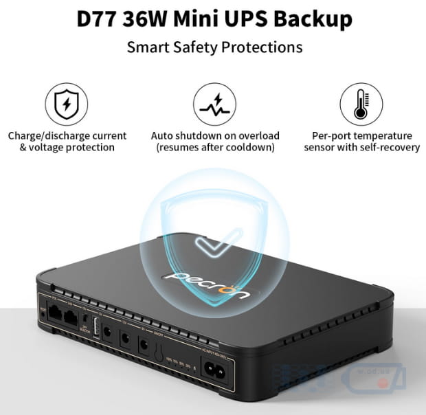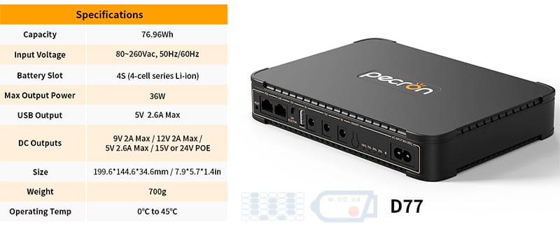 Источник бесперебойного питания mini DC UPS Pecron D77 36 Вт (АКБ 76.96Wh - 14.8V5.2Ah) технические характеристики и возможности