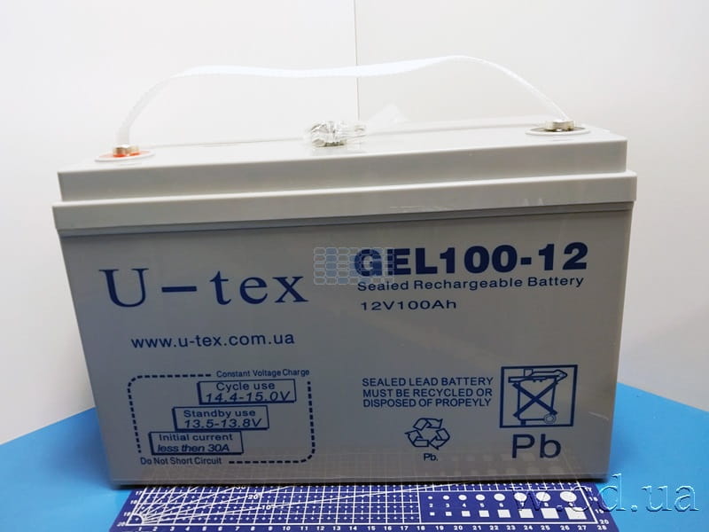 Гелевий акумулятор U-tex 12V 100Ah АКБ (12 В 100 А·год) GEL100-12 - свинцево-кислотний, виконаний у герметичному корпусі та виготовлений за технологією GEL (Gelled Electrolite). Відмінність батареї GEL від класичної АКБ (з рідким електролітом) у тому, що в GEL акумуляторах рідкий електроліт доведений до гелеподібної консистенції шляхом додавання сполук кремнію. Номінальна напруга 12 В (12V), ємність АКБ 100 А·год (100Ah).